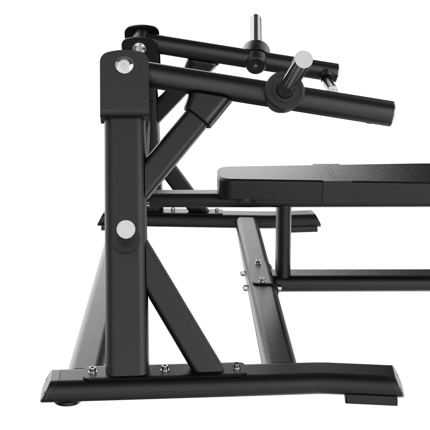 Los soportes laterales para discos agilizan los cambios de carga y ayudan a mantener el área ordenada, algo que suma tanto en la operación del gimnasio como en la experiencia del usuario. La base amplia y equilibrada evita desplazamientos incluso bajo cargas máximas, transmitiendo una sensación de seguridad inmediata al sentarse a entrenar.