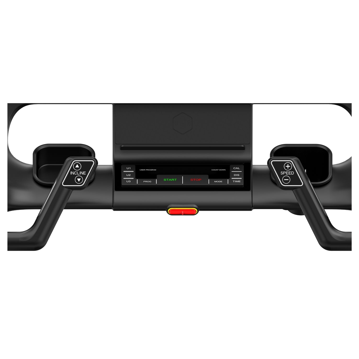 El bastidor de acero de alta resistencia dispersa las fuerzas generadas en cada pisada y soporta usuarios de hasta 180 kg, manteniendo la cinta firme y estable sin importar la intensidad del entrenamiento. El diseño modular facilita el mantenimiento y la sustitución de componentes, prolongando la vida útil del equipo y asegurando un funcionamiento óptimo en entornos de alto tránsito.
