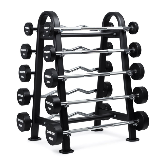 Este set IRONSIDE combina 10 barras precargadas de uso inmediato con un rack de almacenamiento compacto y resistente, ideal para gimnasios, estudios de entrenamiento y espacios funcionales que buscan orden, variedad y agilidad en la rutina. El pack incluye 5 barras rectas y 5 barras EZ, cada una disponible en pesos de 10, 15, 20, 25 y 30 kg, permitiendo trabajar con diferentes niveles de carga sin necesidad de cambiar discos.
