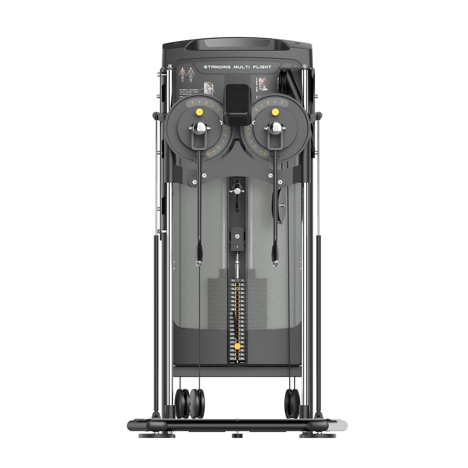 La Standing Multi Flight Machine IRONSIDE Luxe es una estación selectorizada pensada para trabajar pecho y hombros con precisión quirúrgica y sin atajos de catálogo. Con 14 niveles de altura del pivote y un disco de regulación con 13 posiciones, permite aperturas de pie, cruces en arco, elevaciones laterales y variantes inclinadas manteniendo una línea de fuerza limpia y repetible. Su trayectoria en arco acompaña la anatomía del hombro para que cada repetición cargue donde tiene que cargar, sin tironeos ni cambios bruscos de palanca que rompan el gesto, algo clave cuando programás bloques largos o series descendentes con poco margen de error.