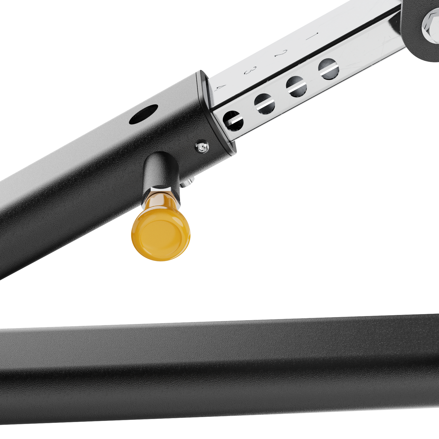 En bancos declinados, un milímetro de juego se siente como un centímetro: por eso la base de apoyo y el largo del bastidor están dimensionados para resistir cargas altas sin flexión perceptible, de manera que la trayectoria de la barra no cambie entre la primera y la última repetición. Este aplomo es clave para programar progresiones finas, porque si el banco no se mueve, podés concentrarte en la técnica, el set-up escapular y la respiración sin desperdiciar esfuerzo estabilizando el mueble.
