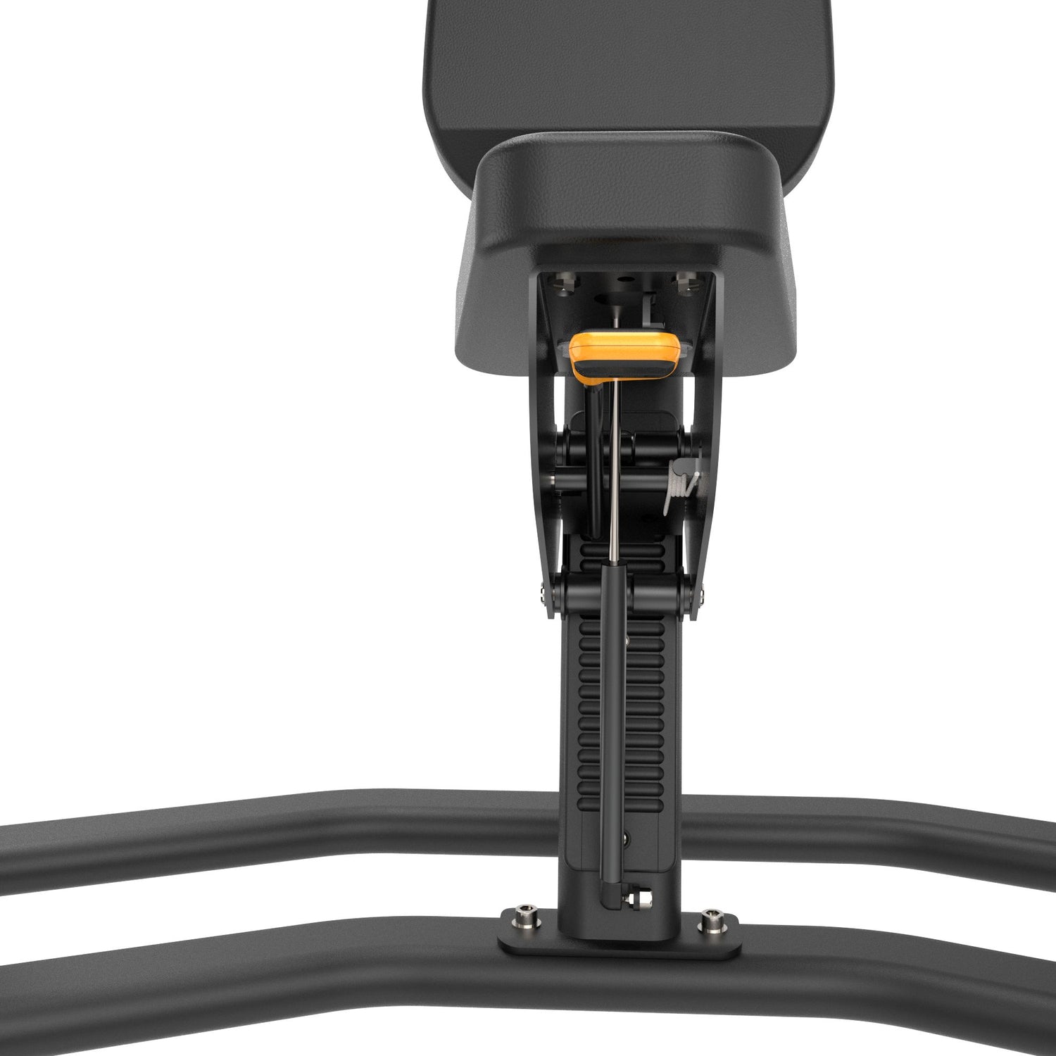 El asiento regulable en altura mediante pistón a gas permite ajustes rápidos, suaves y precisos, garantizando que cada usuario encuentre su alineación ideal con el punto de empuje. El acolchado, fabricado con espuma de alta densidad y recubierto en vinilo cosido, proporciona un soporte firme y ergonómico incluso en sesiones prolongadas.