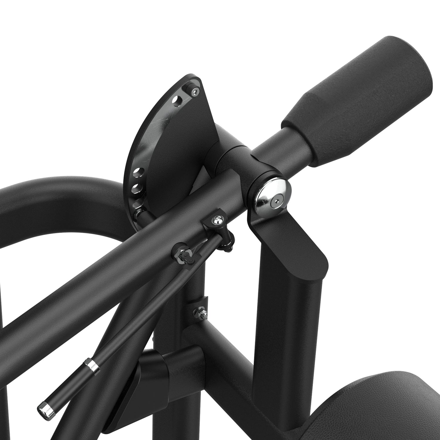 El brazo móvil regulable en 5 posiciones y la altura inicial ajustable en 4 puntos permiten personalizar al detalle la trayectoria del movimiento. Estos ajustes fueron testeados biomecánicamente para asegurar ángulos de carga precisos en la cadera, lo que hace que cada repetición sea segura y efectiva.