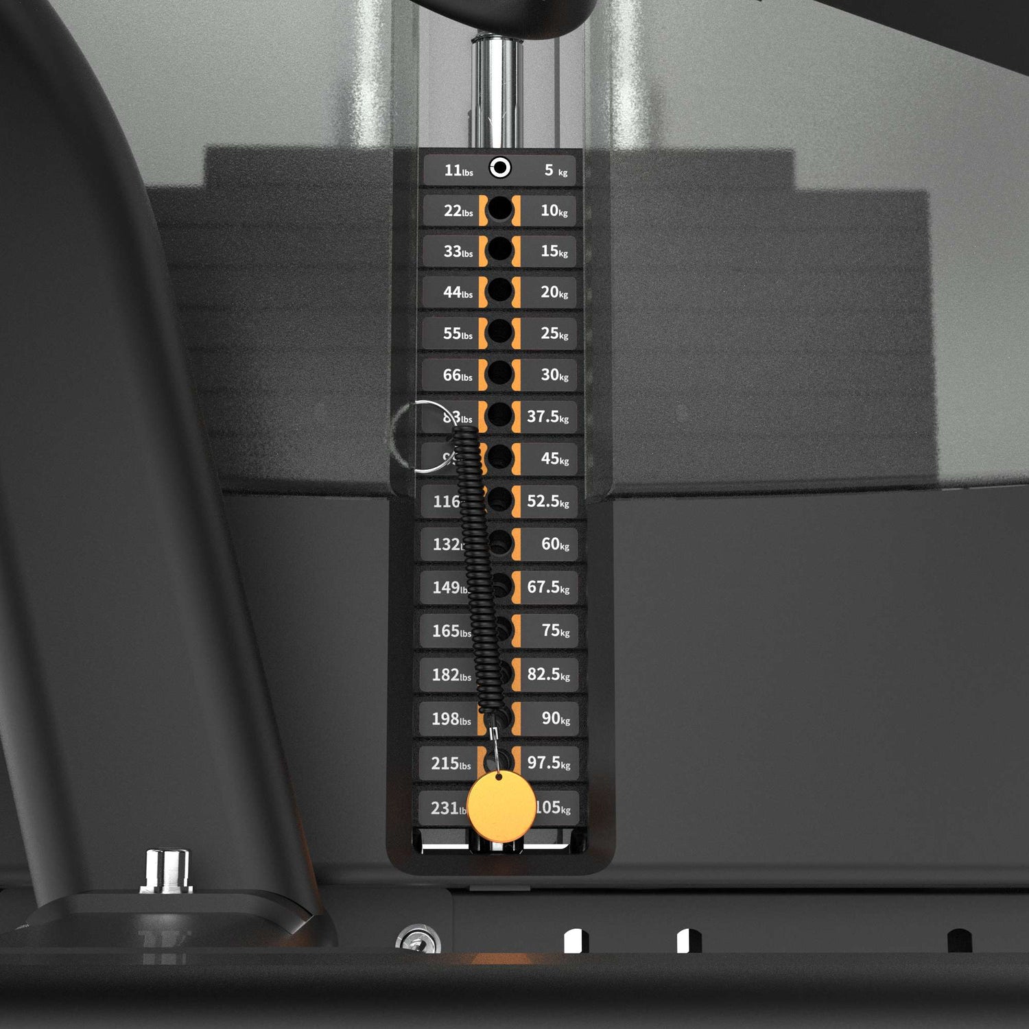 La máquina cuenta con un stack principal de 105 kg, que puede ampliarse a 117,5 kg según las necesidades de progresión. Este sistema de carga, fabricado en hierro fundido de alta densidad con recubrimiento protector, garantiza un movimiento estable y silencioso en cada repetición.