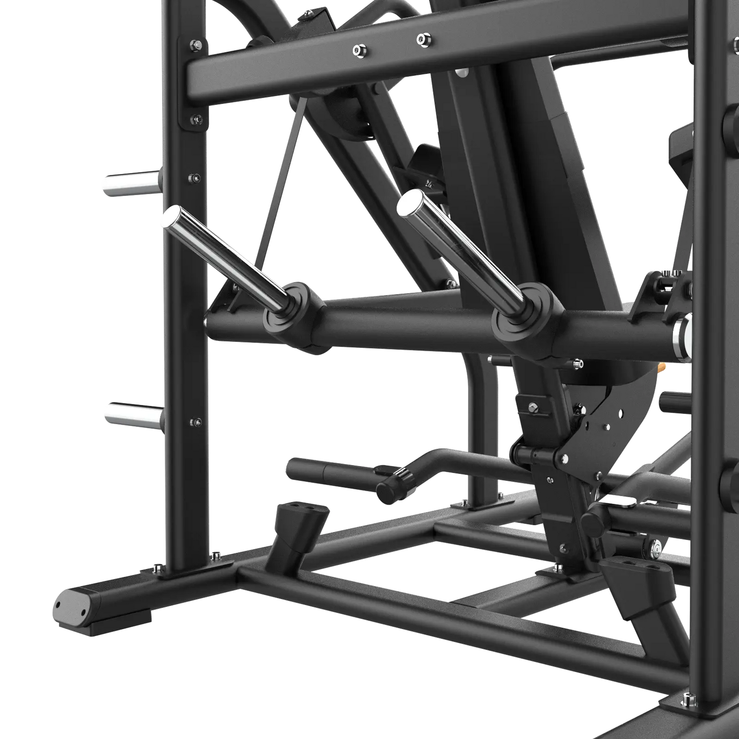 Cuatro pernos de guardado integrados ordenan la zona de carga y aceleran la rotación cuando hay varios usuarios. En entornos comerciales esto acorta transiciones y mantiene el área limpia; en estudios de coaching, mejora la experiencia del alumno, que encuentra todo a mano sin perder tiempo buscando discos. Más orden, más repeticiones útiles y métricas de entrenamiento que después podés analizar sin “ruido”.
